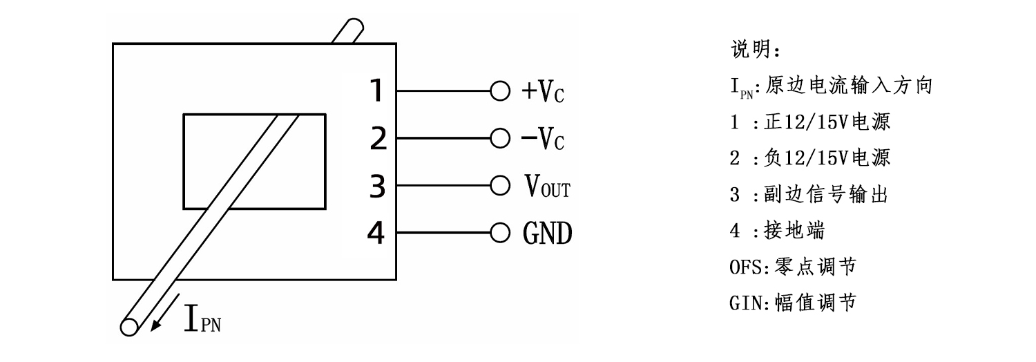 该传感器采用磁平衡霍尔电压检测原理工作。原边电流产生的磁通量与霍尔电压经过放大产生的副边电压,通过副边线圈所产生的磁通量相平衡,副边电压便能精确地反应原边电流。